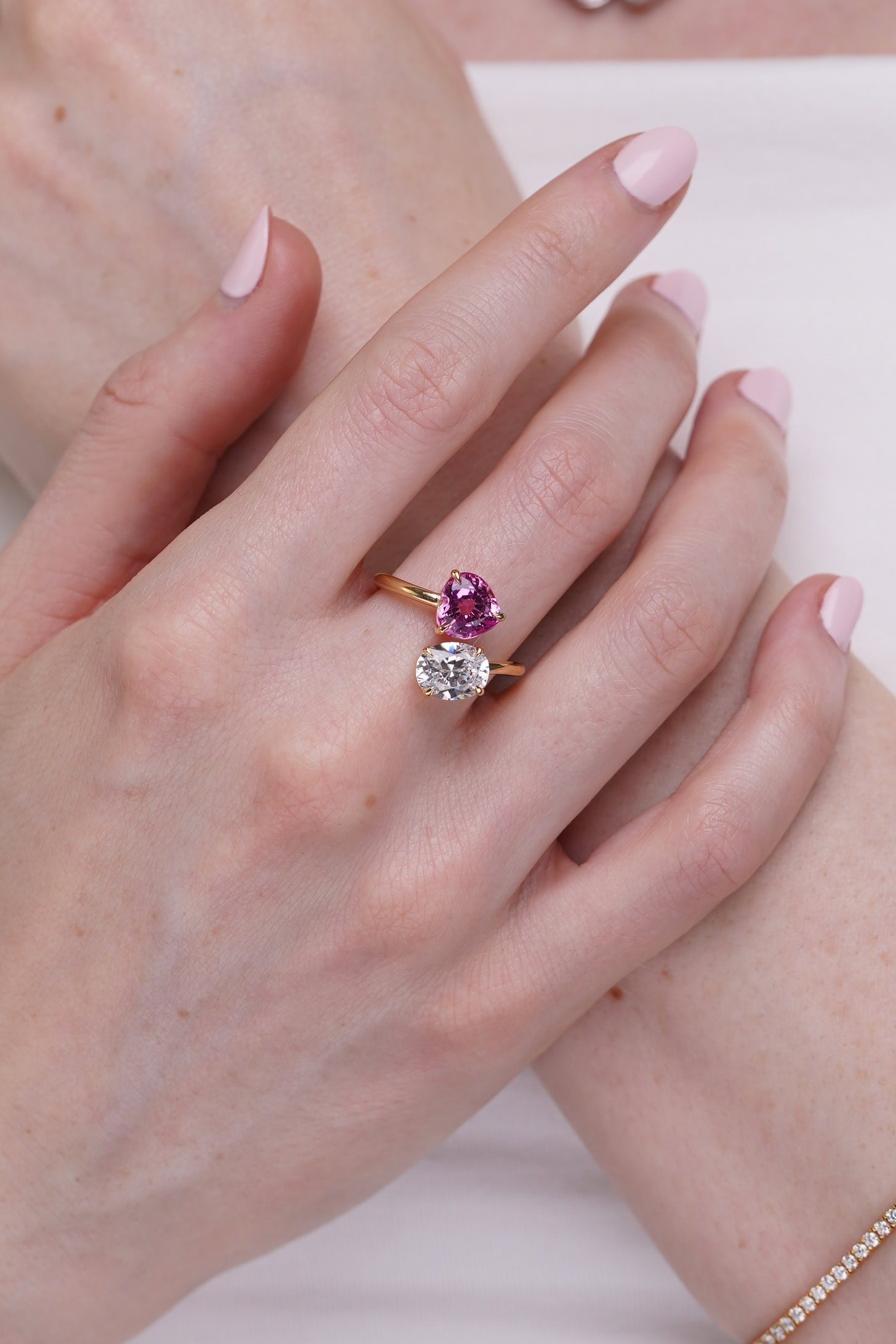 Our custom, double stone Toi et Moi rings are made of stones that have personal significance, like your birthstones, heirlooms, or favorite gems. Mix different cuts, sizes, and colors to make it as unique as your story.